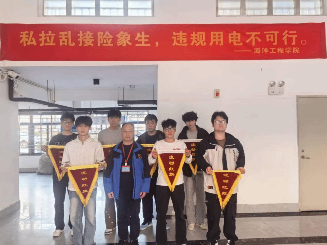 3月18日下午,宿管邱华顶在九号学生宿舍楼一楼大厅为获评满分宿舍的学生代表颁发流动红旗。