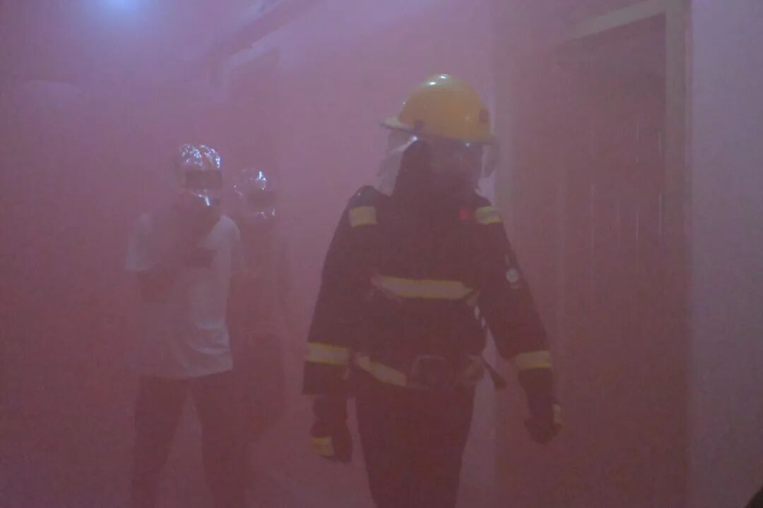 演练正式启动后,现场模拟火情点燃专用烟雾,楼道内瞬间浓烟弥漫,安全警报同步响起,高度还原真实火灾险情,为师生营造沉浸式应急场景。