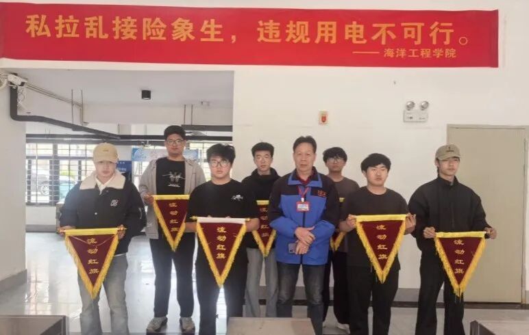 3月25日下午,宿管陈良华在九号学生宿舍楼一楼大厅为获评满分宿舍的学生代表颁发流动红旗。