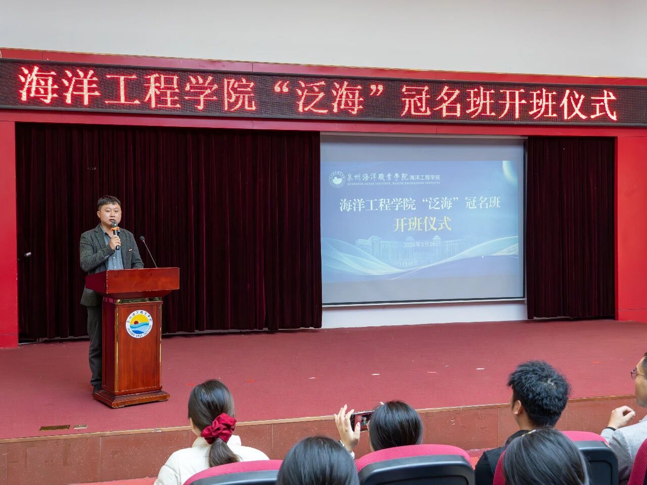 3月26日下午,海洋工程学院“泛海”冠名班开班仪式在2204多功能报告厅隆重举行。泉州海洋职业学院副校长刘锦辉,海洋工程学院院长黄加亮、党支部书记周甜、党支部副书记俞建梁、2024级轮机工程技术专业辅导员及部分专任教师,厦门泛海国际船舶管理有限公司副总经理周永煌、经理陈宾鸿、船长许中无、轮机长李典有出席仪式,“泛海”冠名班全体学员共同参与本次活动。会议由俞建梁主持。