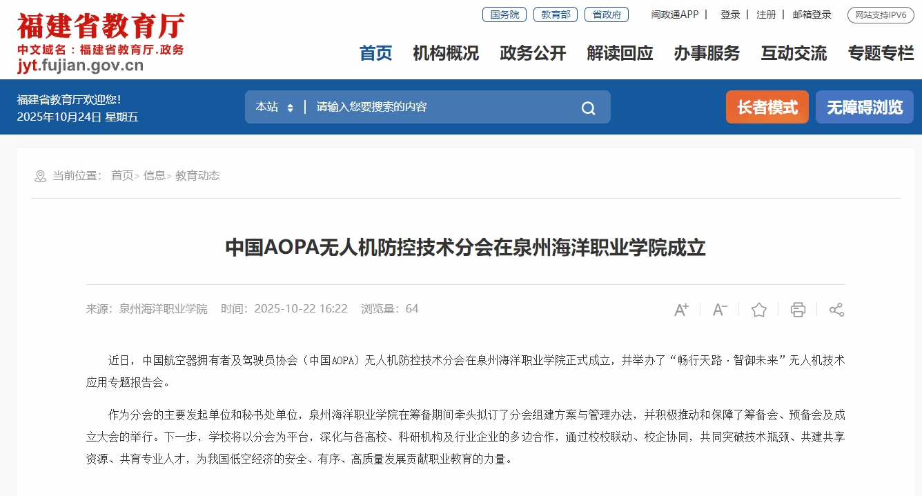 【省教育厅-福建职业教育】中国AOPA无人机防控技术分会在泉州海洋职业学院成立