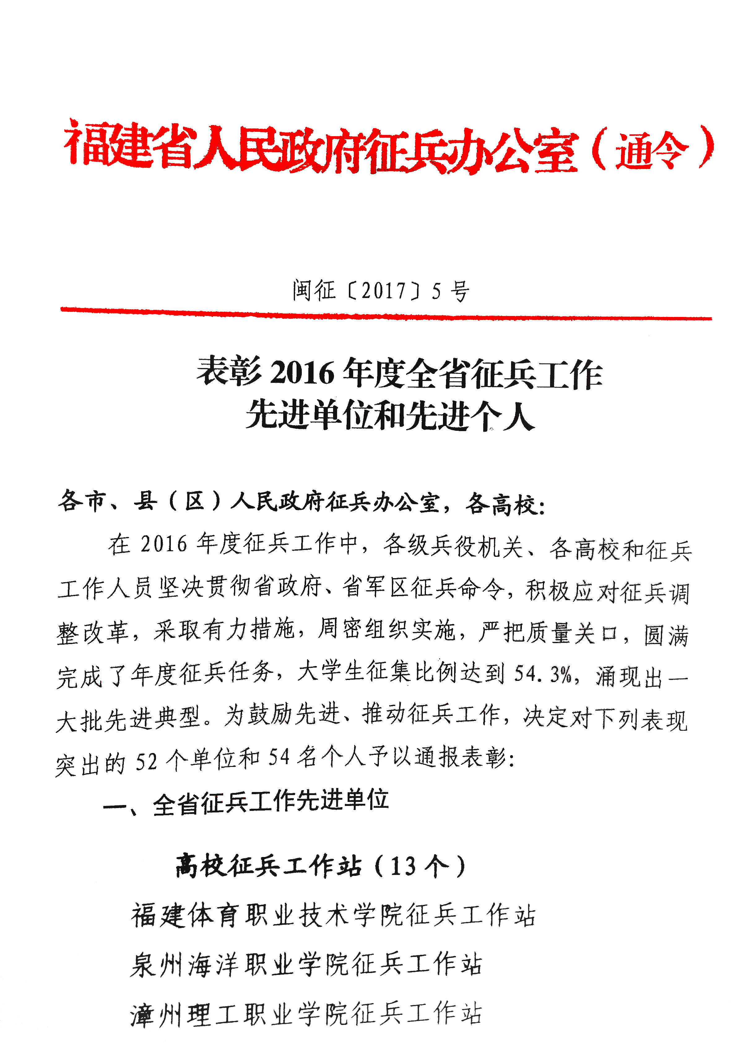 新闻中心讯(党政办报道)近日,福建省人民政府征兵办公室发布闽征〔2017〕5号文件《表彰2016年度全省征兵工作先进单位和先进个人》,泉州海洋职业学院征兵工作站被确定为福建省征兵先进单位。