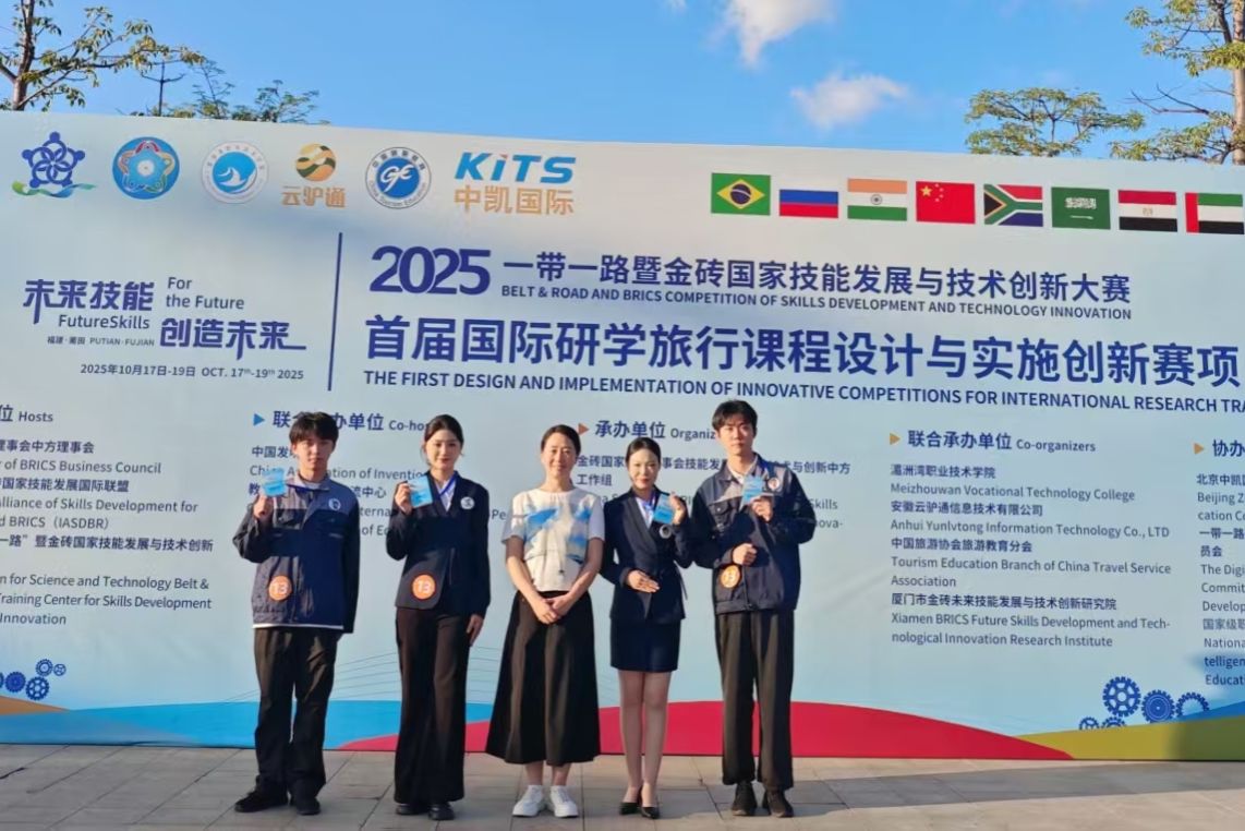 (新闻中心讯 健康休闲学院供稿 党委宣传部报道)10月19日,2025“一带一路”暨金砖国家技能发展与技术创新大赛首届国际研学旅行课程设计与实施创新赛项(华南赛区)在莆田圆满落幕。由我校健康休闲学院闫花帅老师与航海交通学院潘芳芷老师共同指导,严钰柔、吴建新、张巧燕、张进鑫四位同学组成的代表队荣获职教组三等奖。