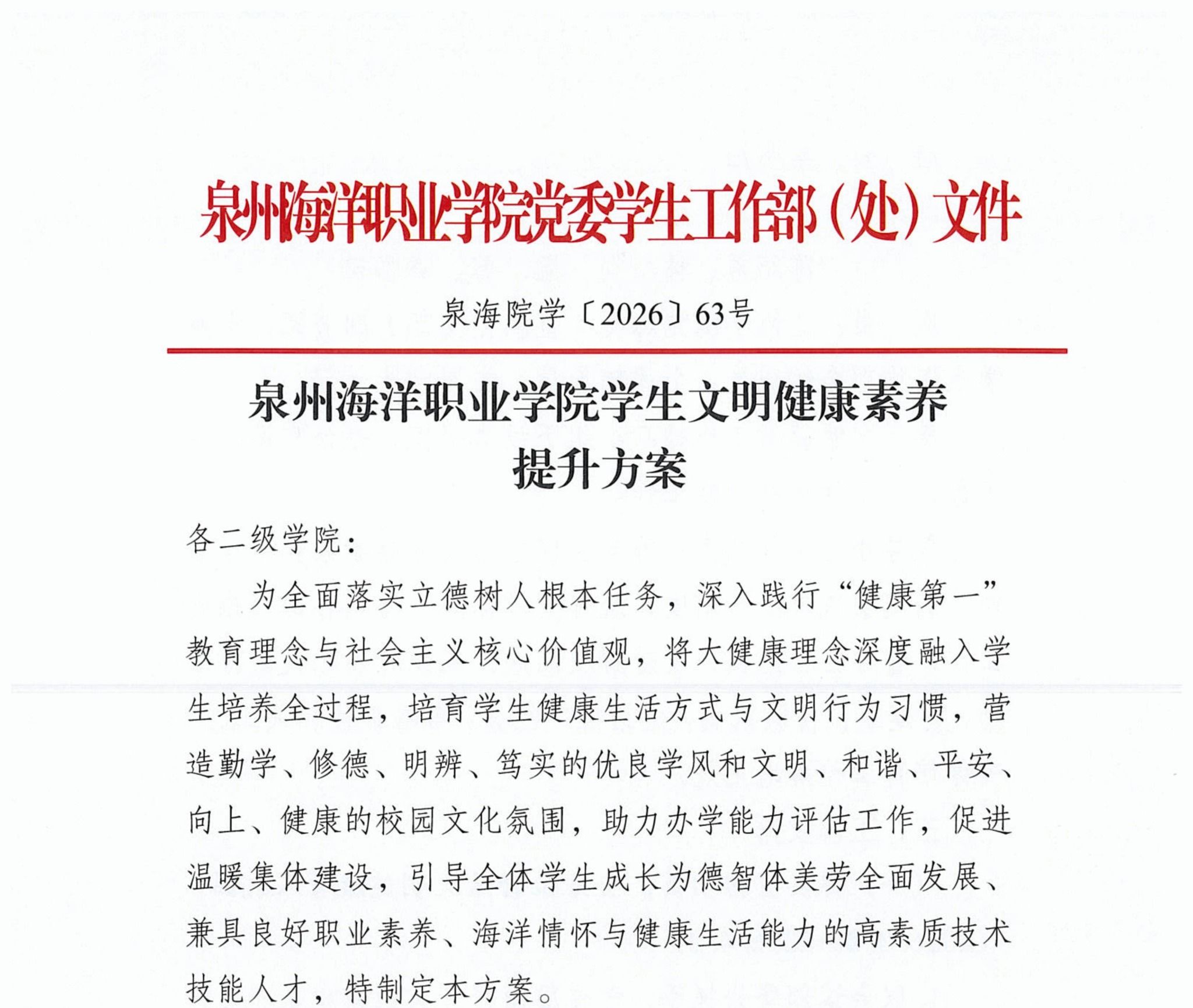 21天养成计划突出三大亮点:文明与健康深度融合、三级联动闭环管理、奖惩并举精准育人。学校希望用小习惯撬动大素养,营造勤学、修德、明辨、笃实的学风,打造文明和谐、平安向上的校园生态,助力每位同学成长为兼具文明素养、健康能力与海洋情怀的高素质技术技能人才。