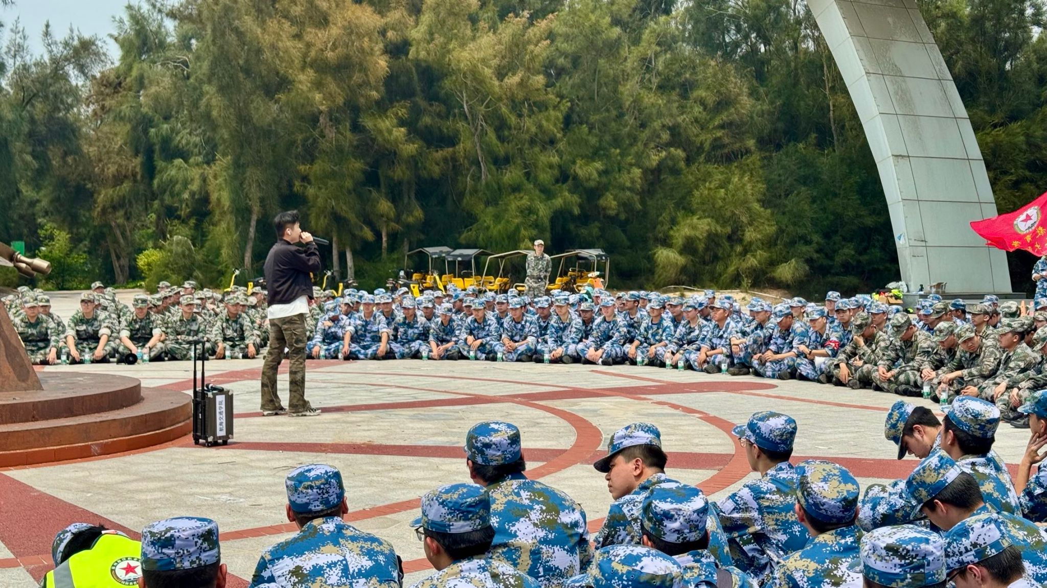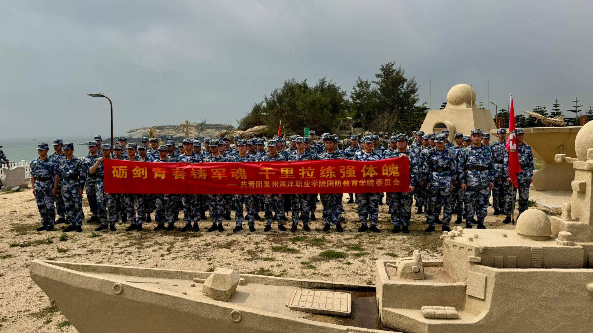队伍按计划抵达军事公园集结地域。讲解员依托福建军舰沙塑模型,介绍了相关海防历史与舰艇知识,同学们列队聆听,神情专注。