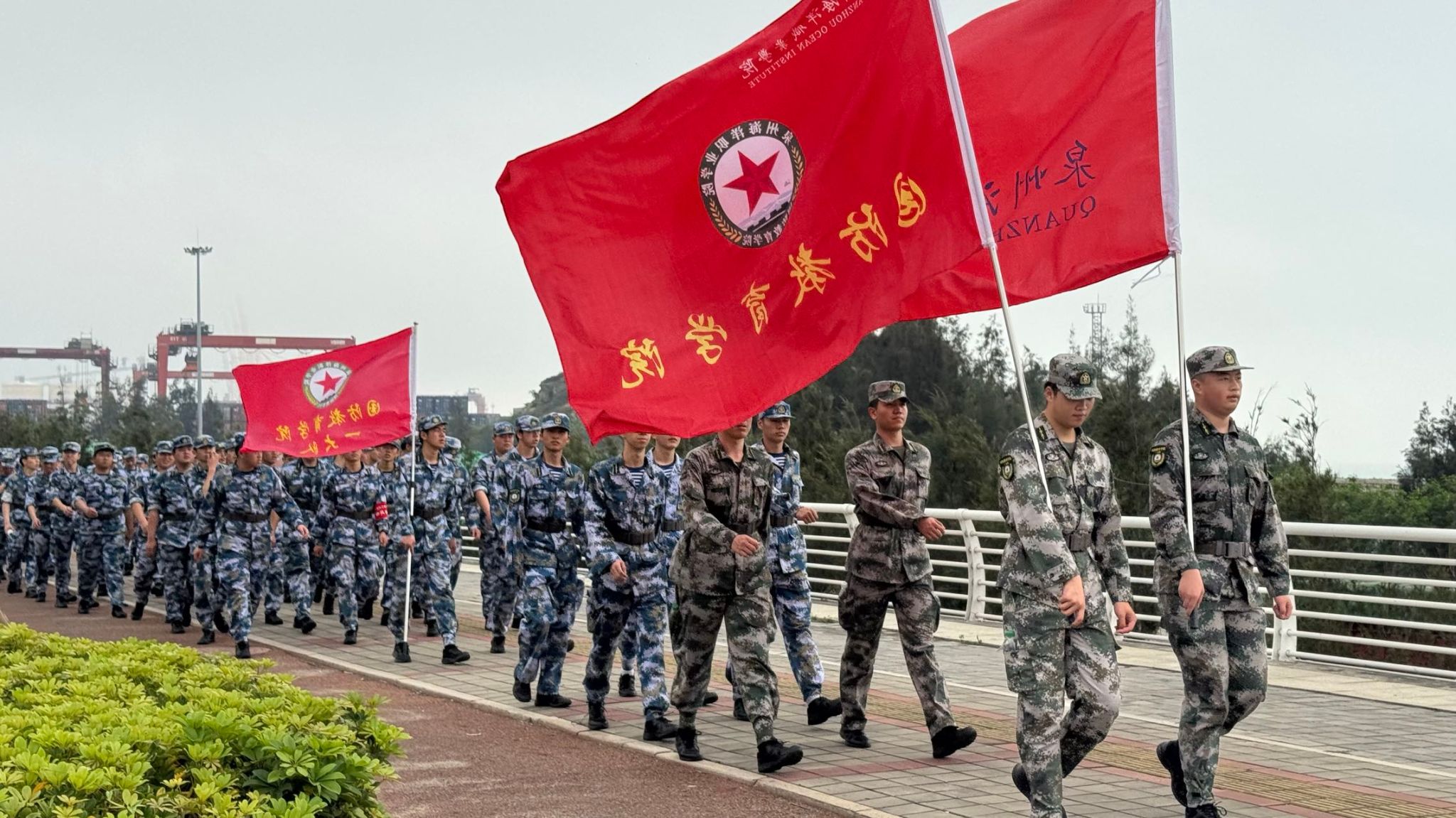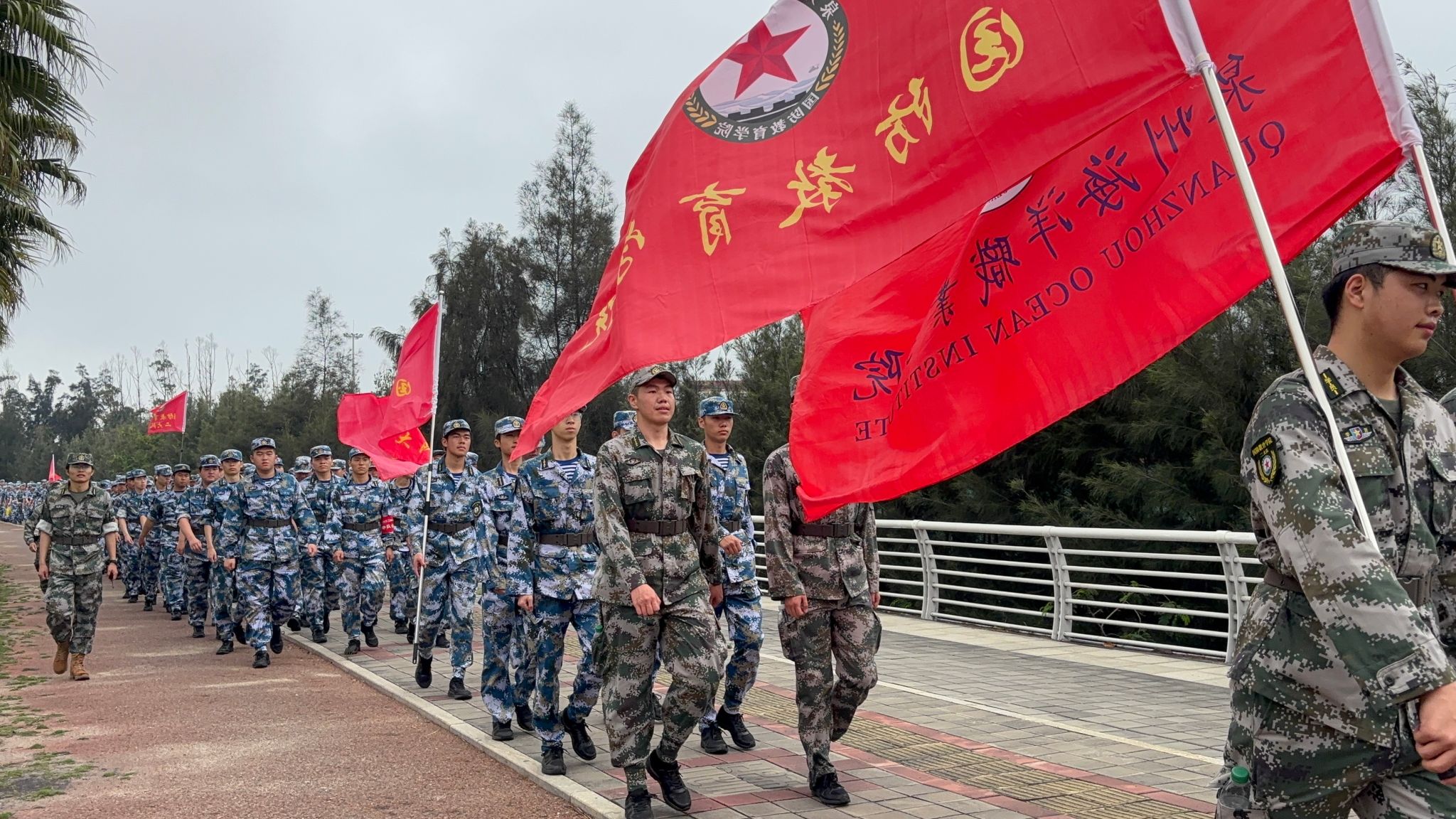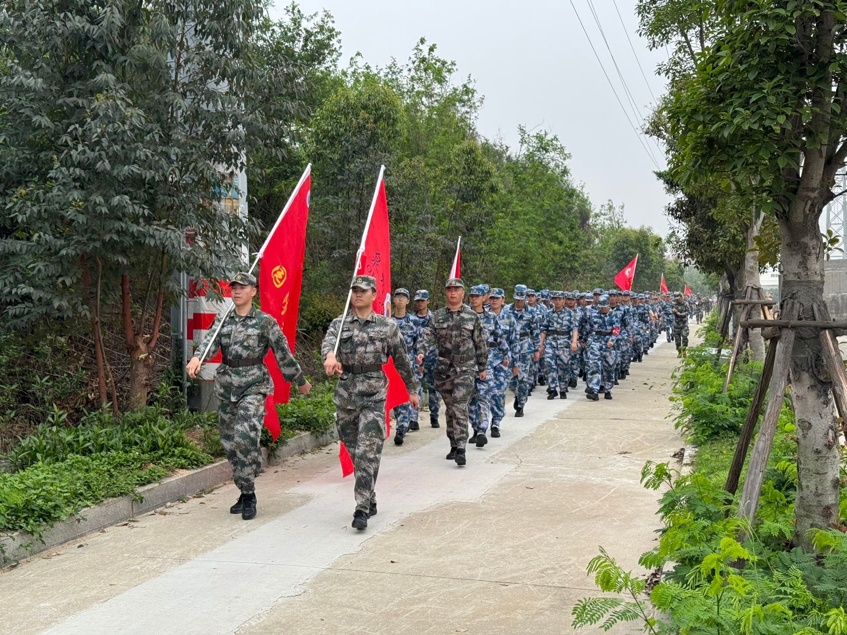 队伍成两路纵队沿预定路线行进,红旗在队首迎风招展。“一二三四”的呼号声此起彼伏,各大队轮流领唱《强军战歌》《团结就是力量》等军旅歌曲,节奏稳定、气氛热烈。行军途中,个别学员出现低血糖、中暑等身体不适,随队医疗保障人员迅速处置,经短暂休整后均顺利归队。全程无一人掉队,行进秩序始终严整。