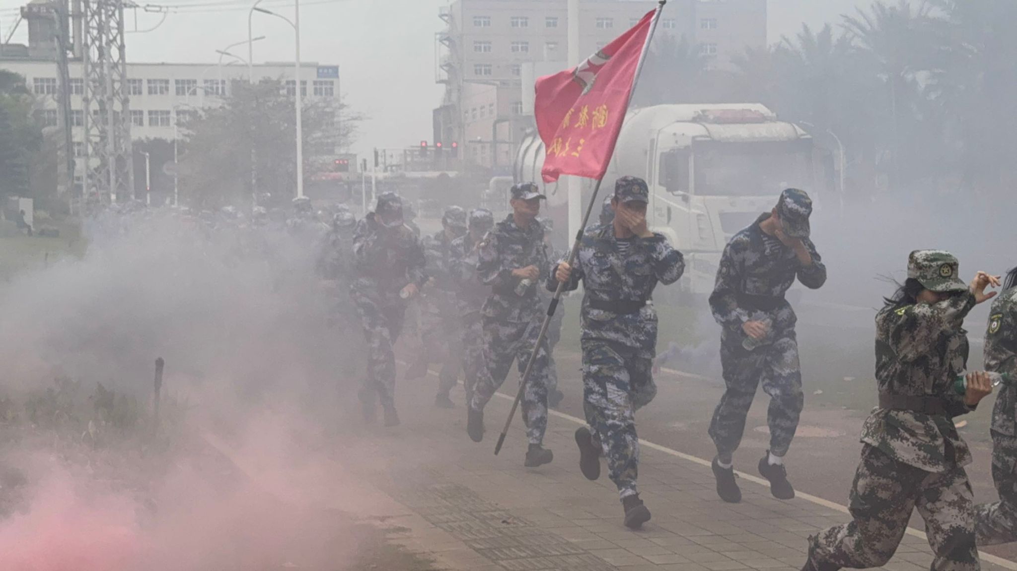 行至中途预设演练路段,橙色烟雾在地面燃起。“前方染毒地带,迅速防护通过!”指挥员口令下达后,全体学员动作统一,以衣袖捂住口鼻,压低重心,沿烟雾侧翼快速有序通过。从发现情况到全员安全穿越,过程衔接紧密,展现了日常防护训练的扎实成效。