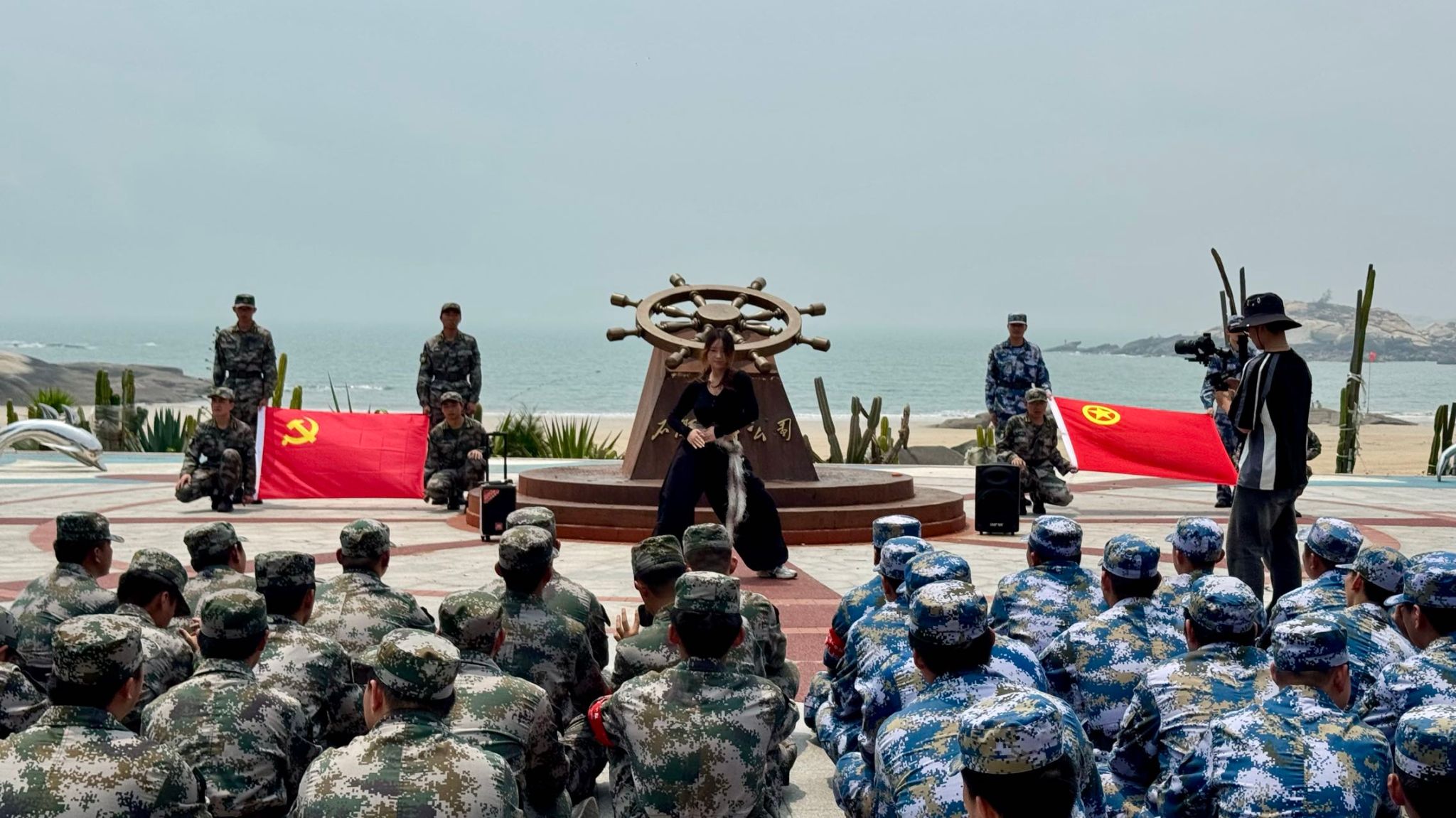 歌舞表演结束后,全体人员肃立,奏唱中华人民共和国国歌。雄壮的旋律在海天之间响起,每一个人神情庄重,歌声整齐有力。奏唱完毕,全体学员面向团旗整队肃立,举行重温入团誓词仪式。领誓人走到队列前方,右手握拳举起,全体学员随之高举右拳,字句铿锵,每一张年轻的面孔上都写满庄重。