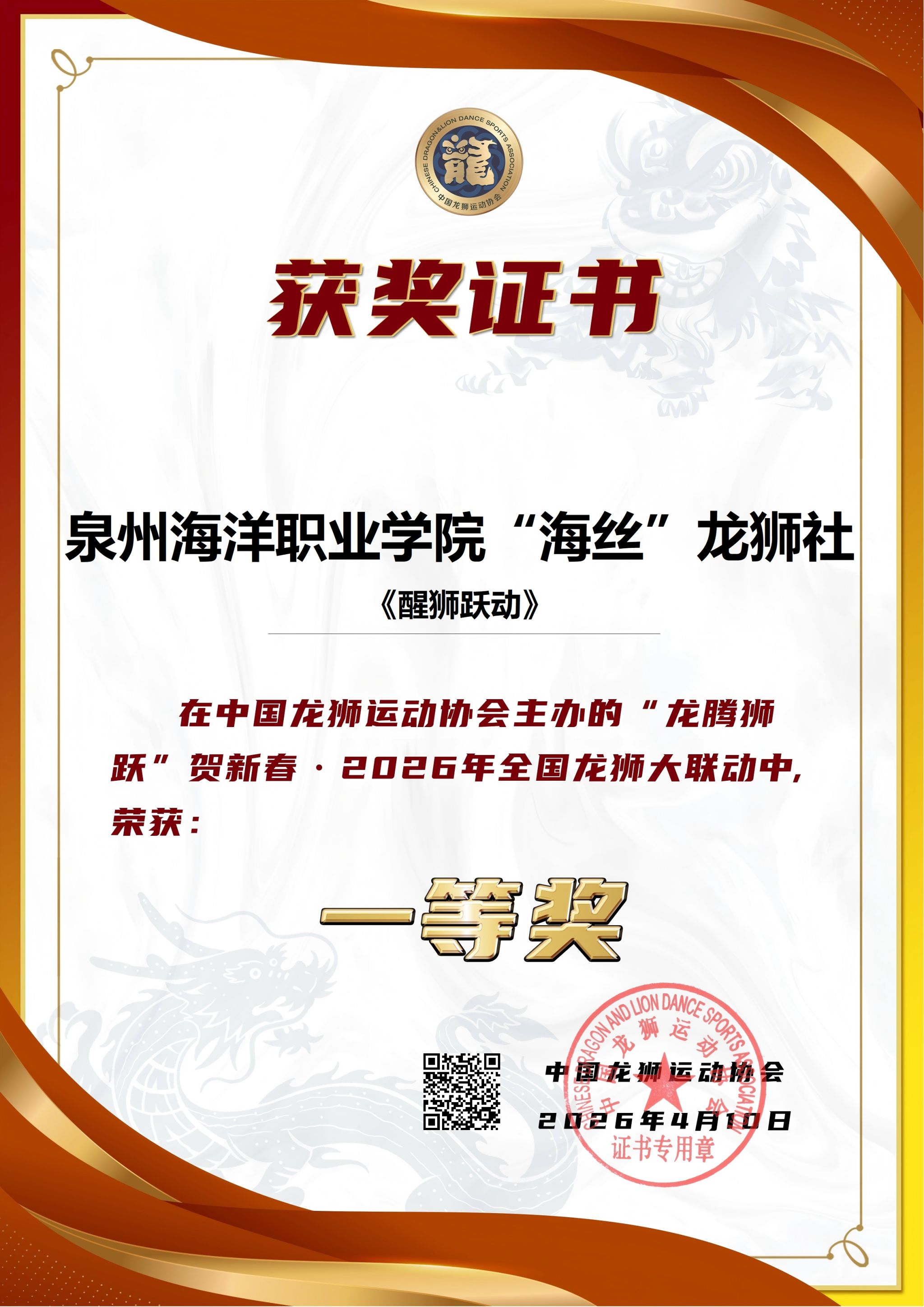 (新闻中心讯 校团委供稿 党委宣传部报道)近日,由中国龙狮运动协会主办的“龙腾狮跃”贺新春·2026年全国龙狮大联动活动评审结果正式揭晓。我校“海丝”龙狮社凭借作品《醒狮跃动》,从全国众多参赛队伍中脱颖而出,斩获全国一等奖,刷新了我校龙狮运动赛事的最佳纪录,充分展现了泉海学子传承中华非遗文脉、勇攀竞技高峰的青春风采。