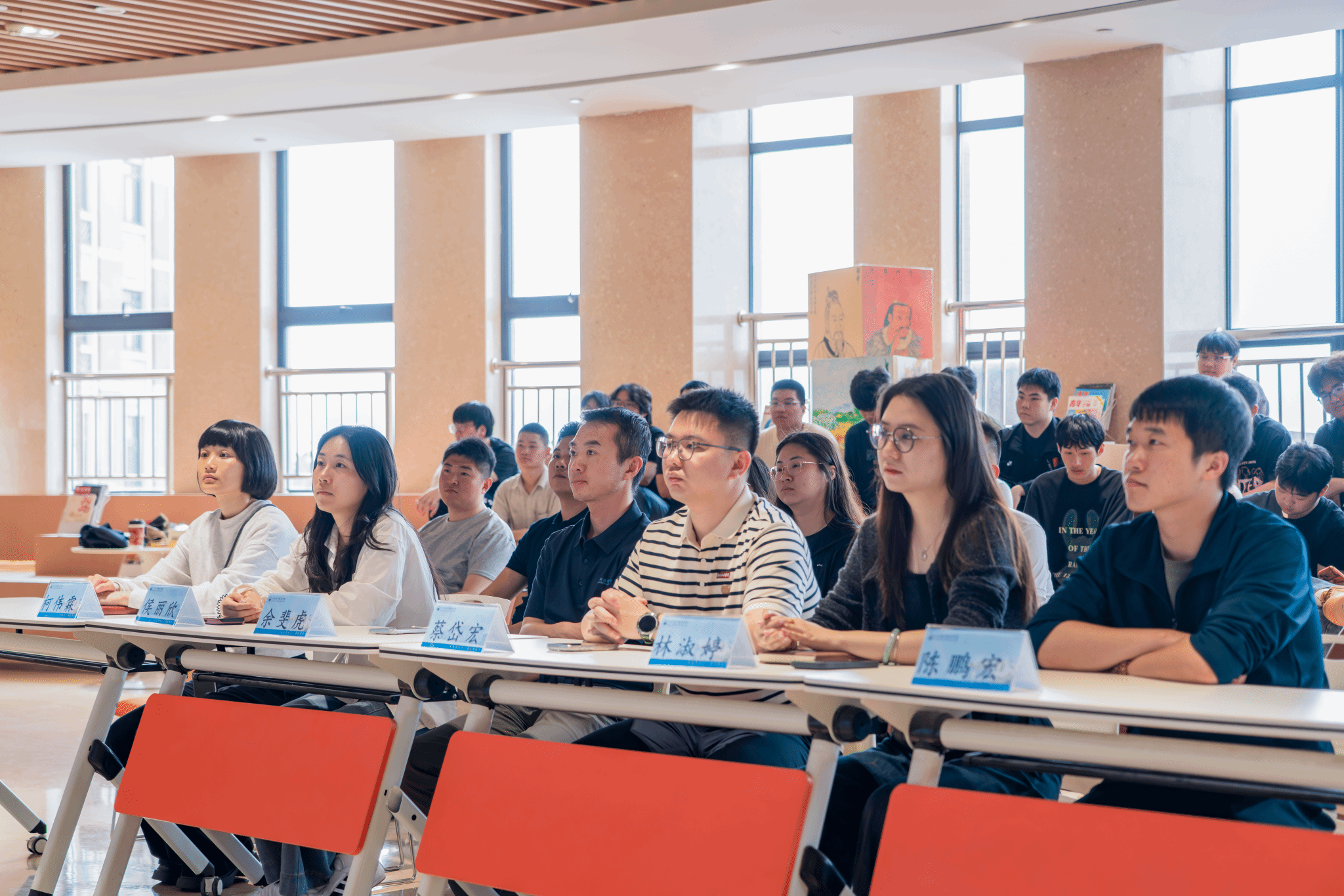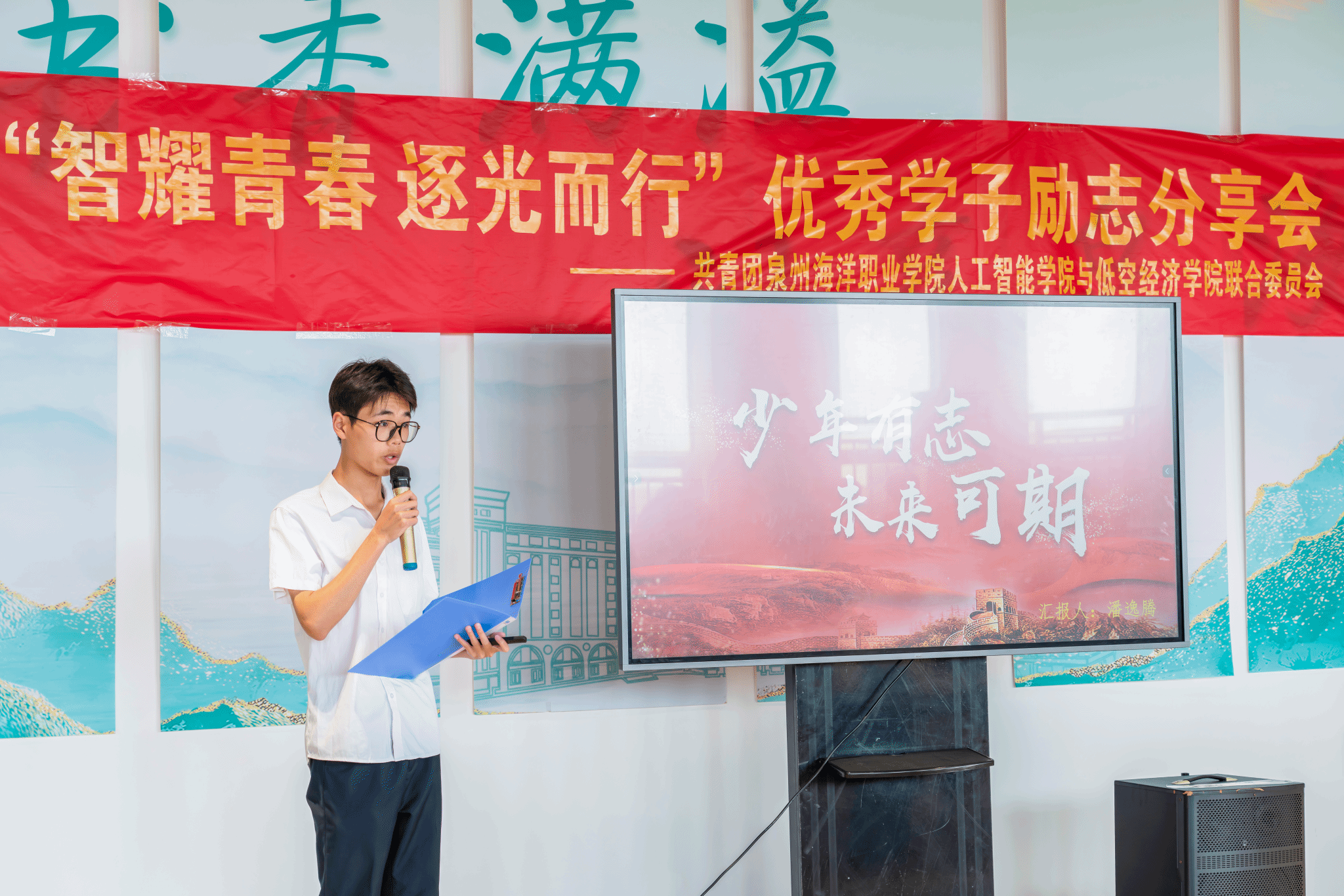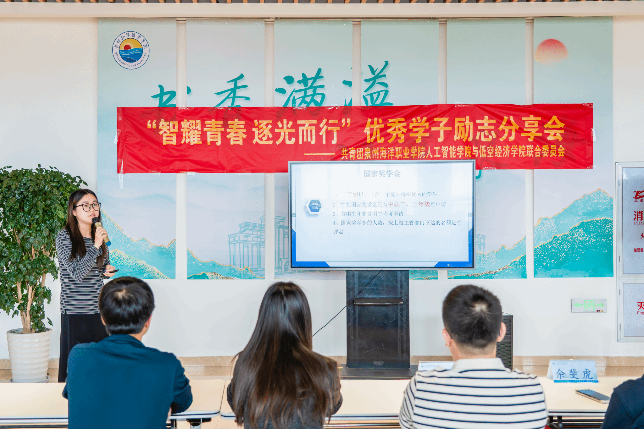 人工智能学院的收官分享会上,国家励志奖学金获得者潘逸腾、国家奖学金获得者陈斯浩,结合学业提升、学生工作与志愿服务,分享知行合一的青春实践。本场特别增设资助政策宣讲环节,范丽菁老师详细解读国家奖学金、国家助学贷款、退役军人教育资助等政策的申请条件与评审标准,阐明志愿服务时长在评审中的重要权重;陈鹏宏老师就退伍学生助学金、国家励志奖学金申请等常见问题补充解答。
