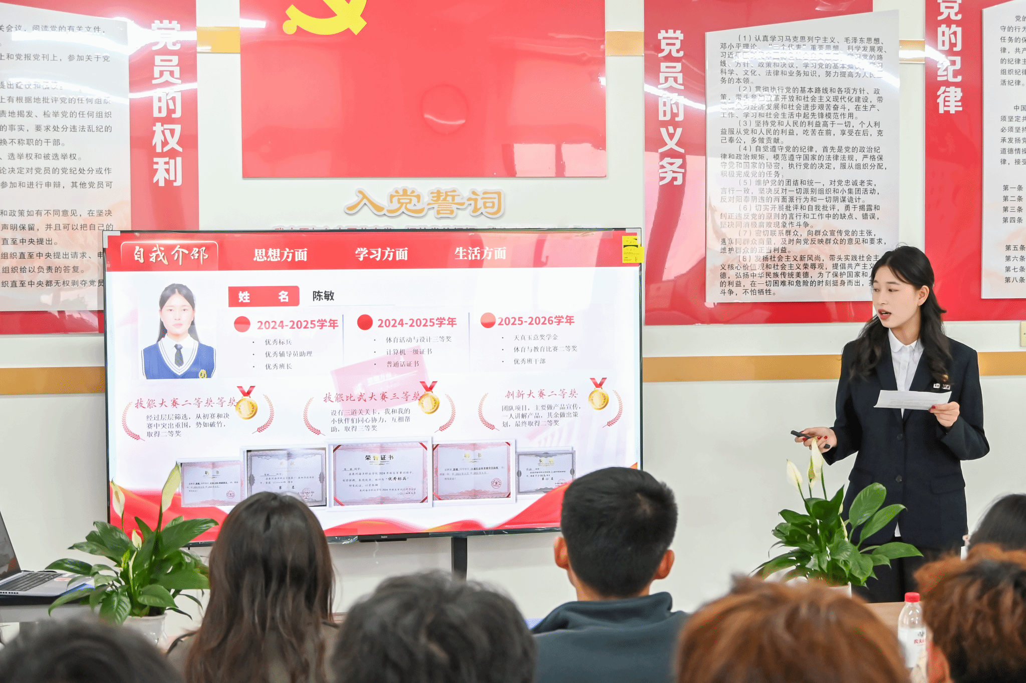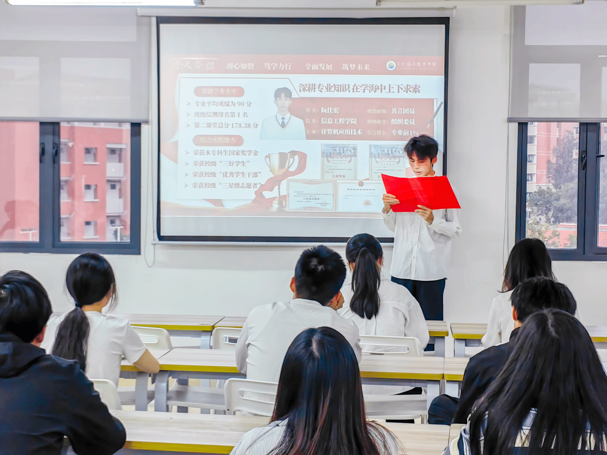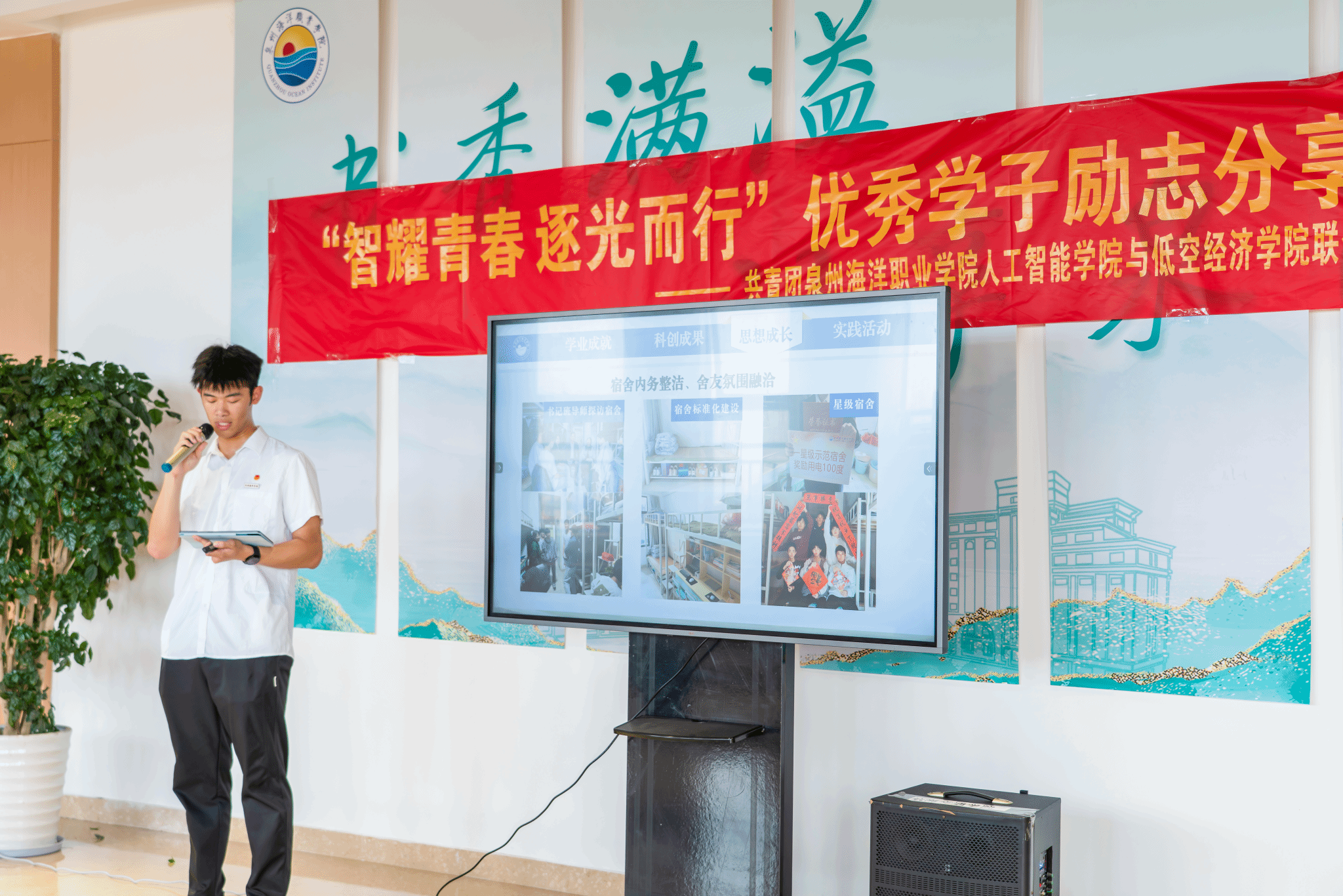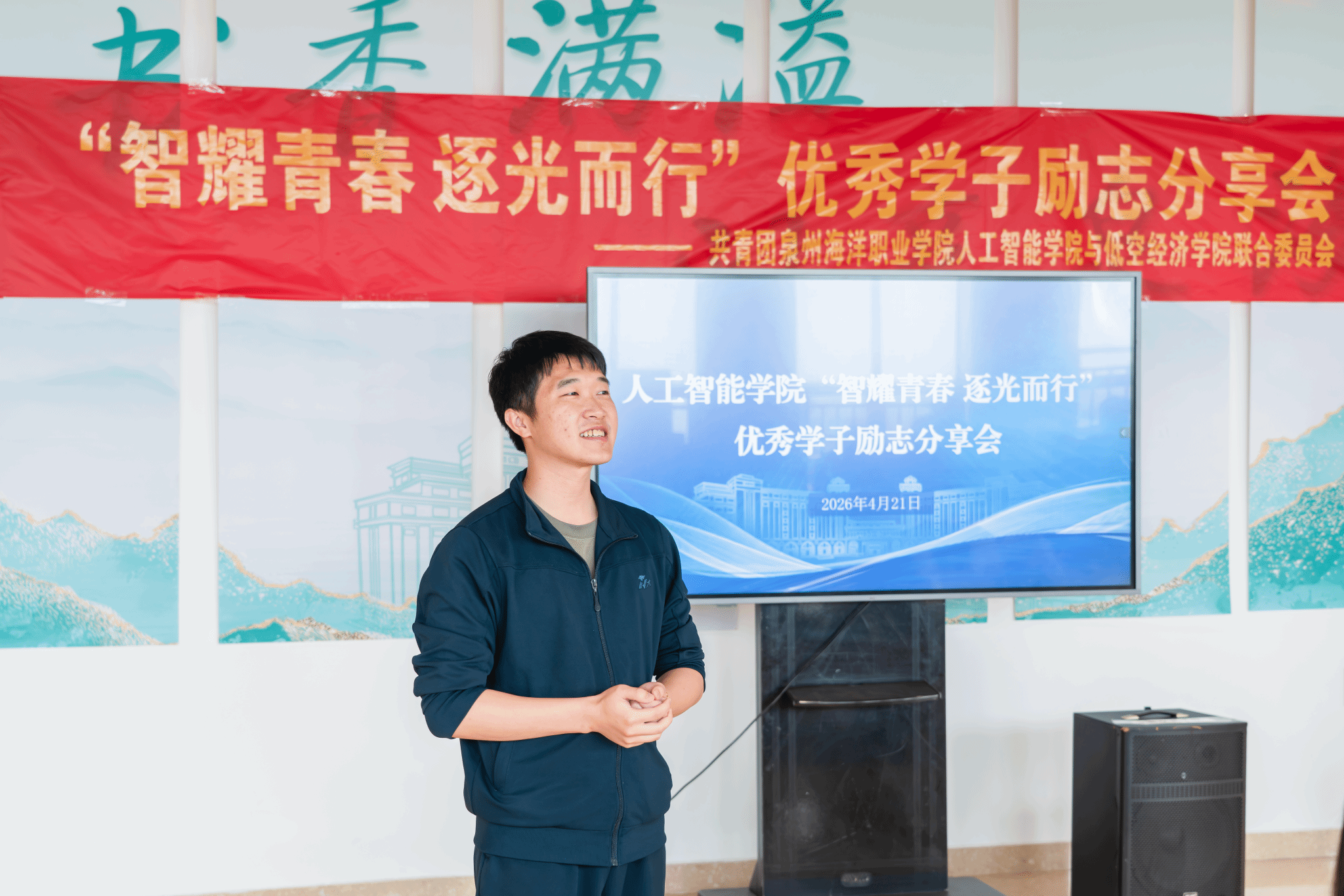 信息工程学院以“青春向上,立足笃行”为主题,聚焦专业成长与青春实践。艺术设计专业郑丽娜分享平衡创作与学业的坚守与突破;阮仕宏讲述在集体服务与实践锻炼中锤炼本领的成长路径。信息工程学院党总支书记温馨表示,奖学金是对学生综合素养的认可,更承载着国家对青年“有理想、有本领、有担当”的殷切期望,鼓励大家以榜样为标杆,既胸怀理想,也脚踏实地。