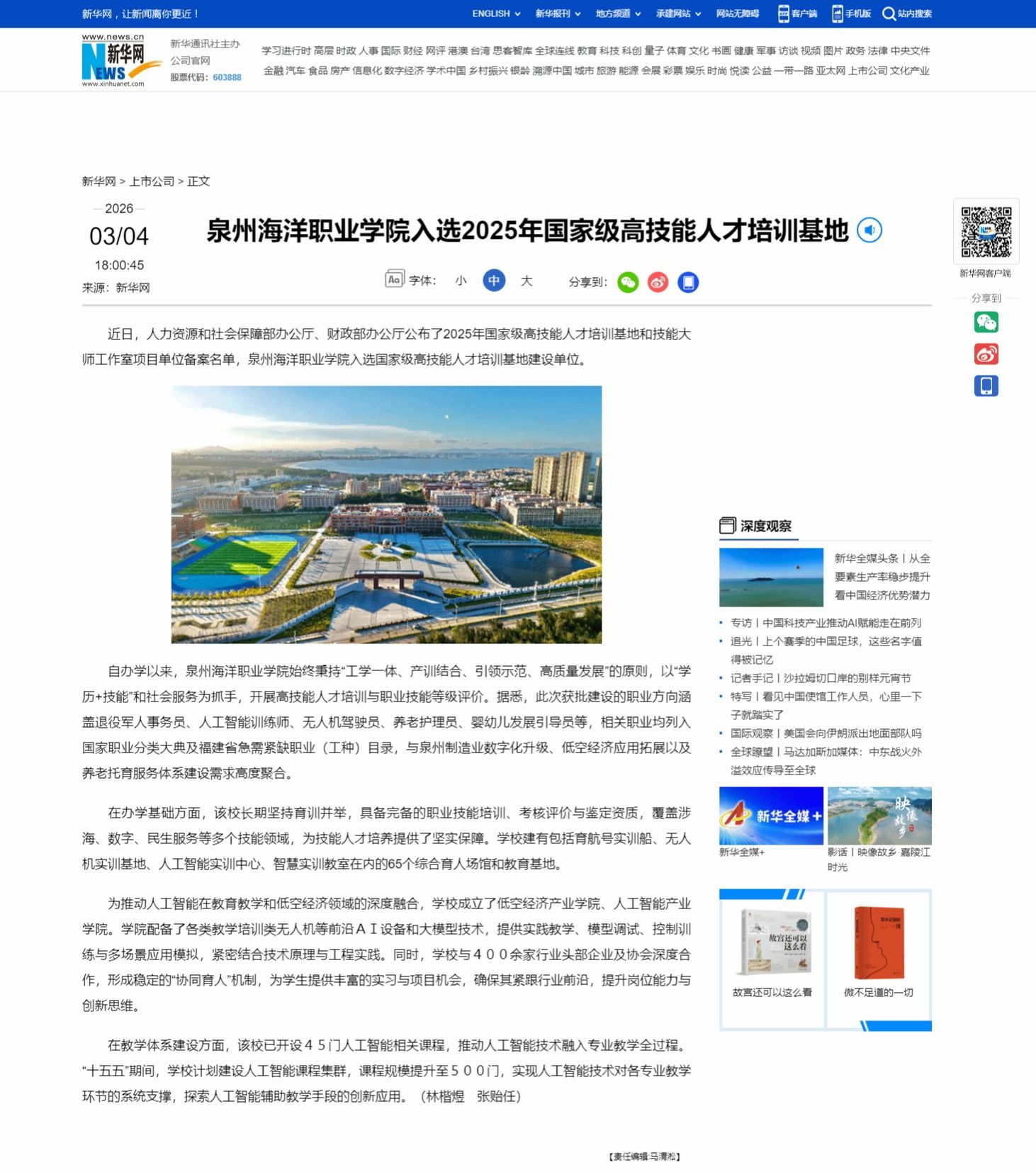 【新华网】泉州海洋职业学院入选2025年国家级高技能人才培训基地