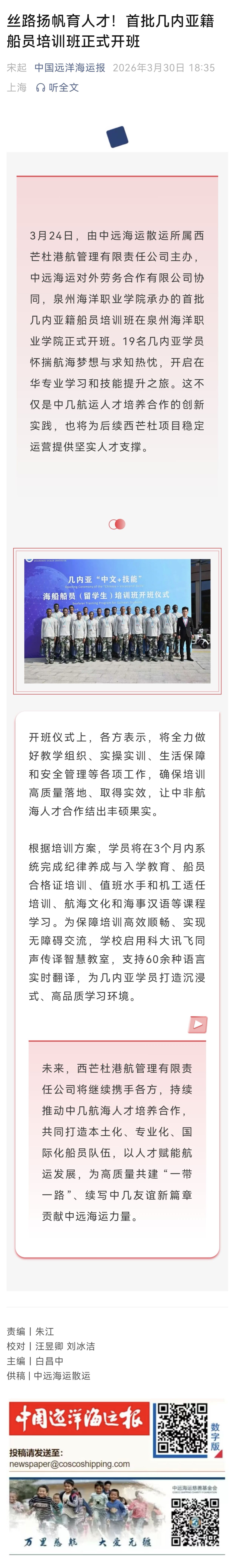 【中国远洋海运报】丝路扬帆育人才!首批几内亚籍船员培训班正式开班