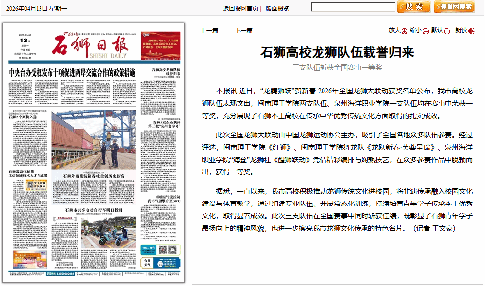 【石狮日报】石狮高校龙狮队伍载誉归来 三支队伍斩获全国赛事一等奖