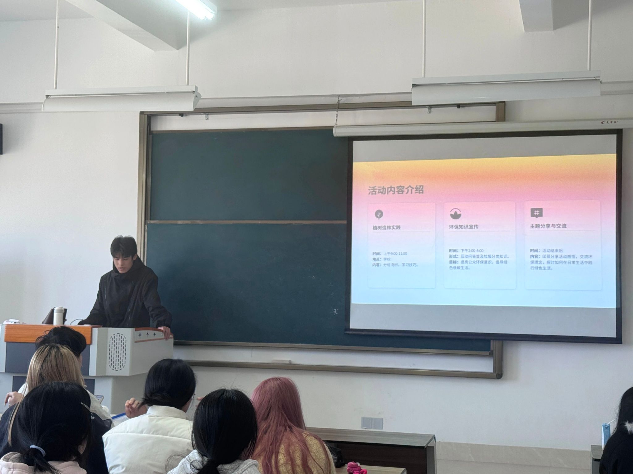 活动伊始,团支书刘奕围绕植树护林、生态保护展开,通过知识讲解、交流分享,引导团员和青年深刻认识绿色发展的重要意义。青春当以行动践使命,以责任护家园,从节约每一度电、每一滴水做起,从爱护花草树木、不乱扔垃圾做起,以实际行动践行环保理念。