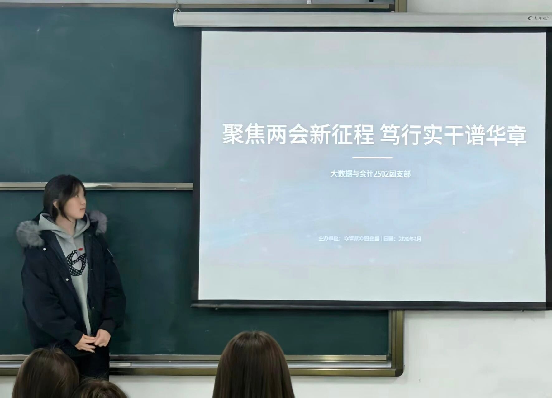 活动伊始,团支书吴伊洋向全体团员介绍本次团日活动的核心主题,结合“十五五”规划与两会精神,解读新时代大学生面临的机遇与挑战,鼓励大家立足专业、放眼未来,在时代浪潮中找准自身定位。