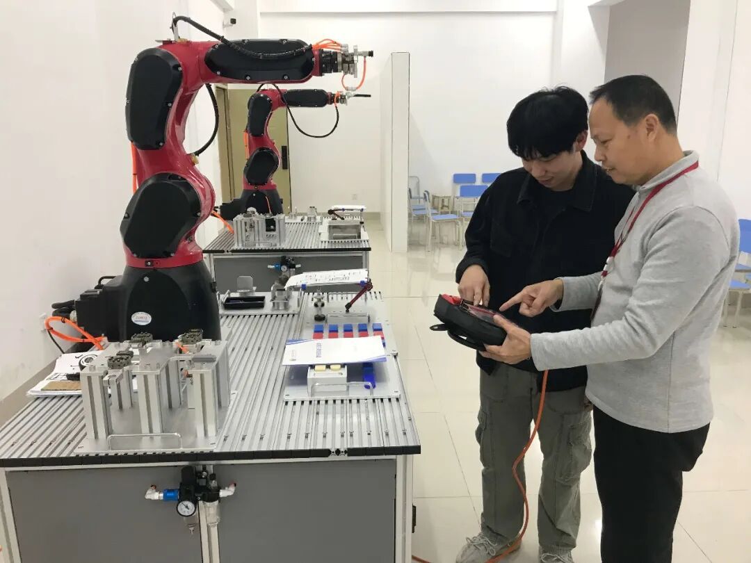 随后,活动移至1409机器人实训室。在这里,教师们深入了解了机械臂的结构原理与操作要点,通过轮流上机操作,熟练掌握了机械臂的抓取、搬运等动作流程,进一步夯实了专业技能基础。实操学习结束后,全体教师进行了深入的教学研讨。大家围绕“如何将实训设备操作融入日常教学”展开热烈讨论,分享了各自在教学设计、教学案例及课件制作方面的经验。针对教学中遇到的实际问题,教师们集思广益,共同探讨解决方案,碰撞出了许多创新的教学火花。