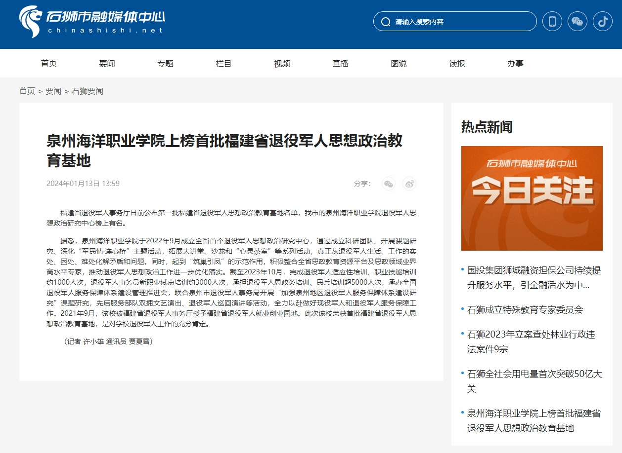 【石狮市融媒体中心】泉州海洋职业学院上榜首批福建省退役军人思想政治教育基地