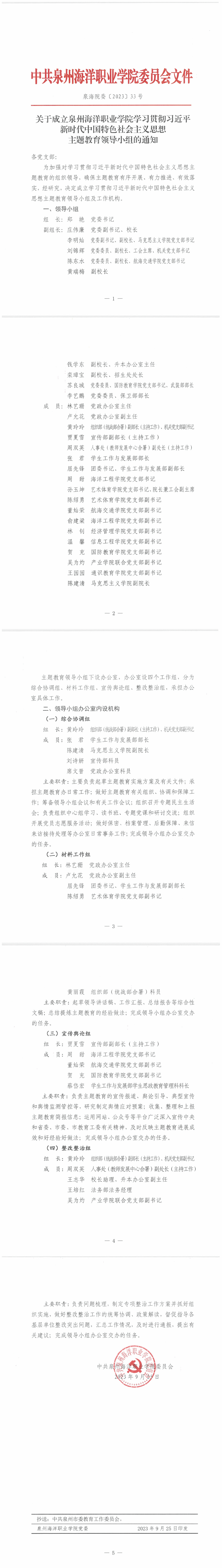 泉海院委〔2023〕33号 关于成立泉州海洋职业学院学习贯彻习近平新时代中国特色社会主义思想主题教育领导小组的通知